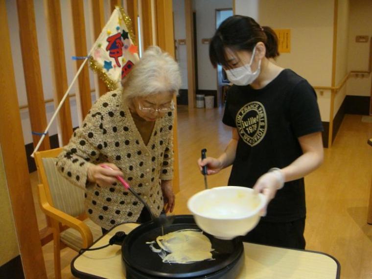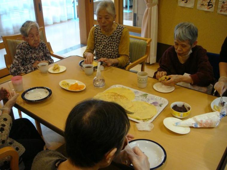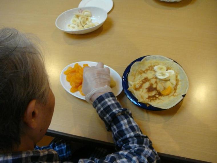 手作りクレープに舌鼓!(もりの家サテライト) 更新日:2018年11月07日 11月7日(水)入居者の皆さんと一緒にクレープを手作りしました。 自分で作ったクレープは最高に美味しかったと感想を頂けました。 人気の組み合わせは、バナナ+みかん+生クリームでした。