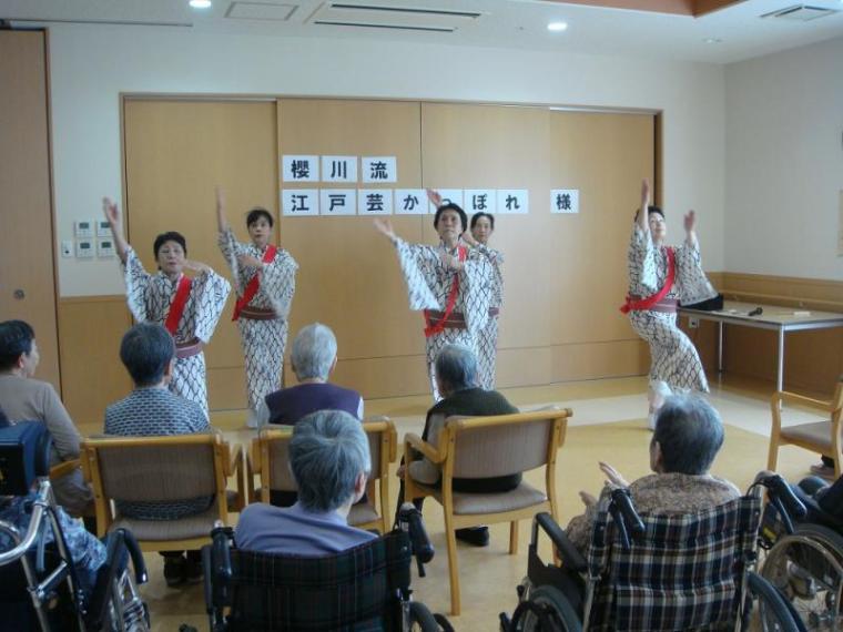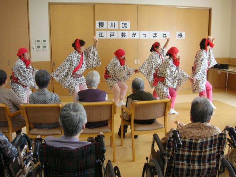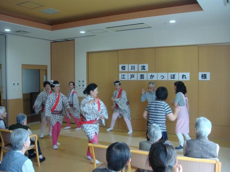 華麗な踊りに酔いしれる!(もりの家サテライト) 更新日:2019年05月22日 今日は、いつもお世話になっています櫻川流江戸芸かっぽれ様に 来所頂きまして、踊りを披露して頂きました。 「黒田節」「東京音頭」「かっぽれ」「ダンシングヒーロー」など 知っている曲が流れると、自然と手拍子が始まり、笑顔が弾けました。 江戸芸かっぽれの皆様楽しい時間をありがとうございました。
