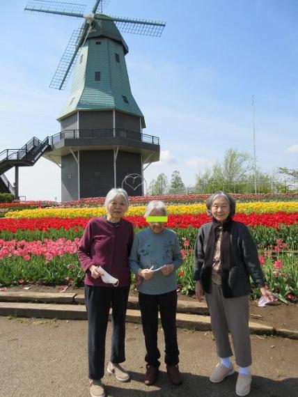 水郷公園・チューリップ見学(もりの家サテライト) 更新日:2022年04月15日 水郷公園のチューリップが満開との情報を聞きつけ、急遽お出かけ してきました。満開のチューリップに、大きな風車、霞ヶ浦の光景は 感動的で、「来てよかった!」「昔の思い出がよみがえった」などと 話が盛り上がりました。 コロナ禍で面会制限が続くなど、閉鎖的な環境からご利用者様のなか には精神的なストレスを抱えている方もいらっしゃると思います。 時間帯やソーシャルディスタンスに配慮しながらも楽しい思い出を 作っていきます。