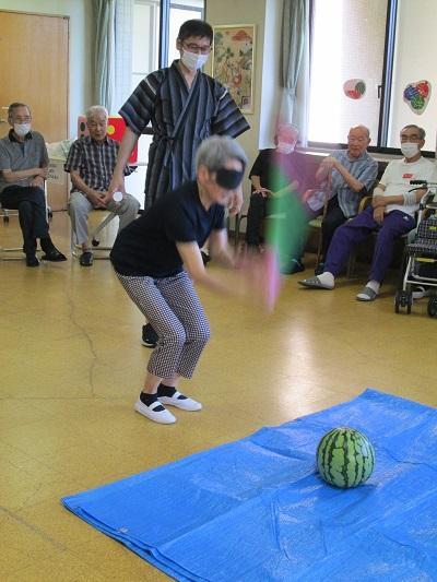 夏祭り(ケアハウス) 更新日:2023年08月18日 8月17日(木) 夏祭りを実施しました!(^^)! 今年は、昨年コロナの影響でできなかったすいか割りも復活し、サイコロを振って出た目の数だけ景品をもらえる「サイコロころころ」も楽しめて、大盛況に終わりました。 屋台では、焼き鳥、枝豆、すいか、ポップコーン、かき氷、ラムネにジュースと、お腹も満足で、特に暑い今年の夏を乗り切る糧になりました。 すいか、めがけて「エイ!!」 今日も暑いι(´Д`υ)アツィー かき氷、おかわり